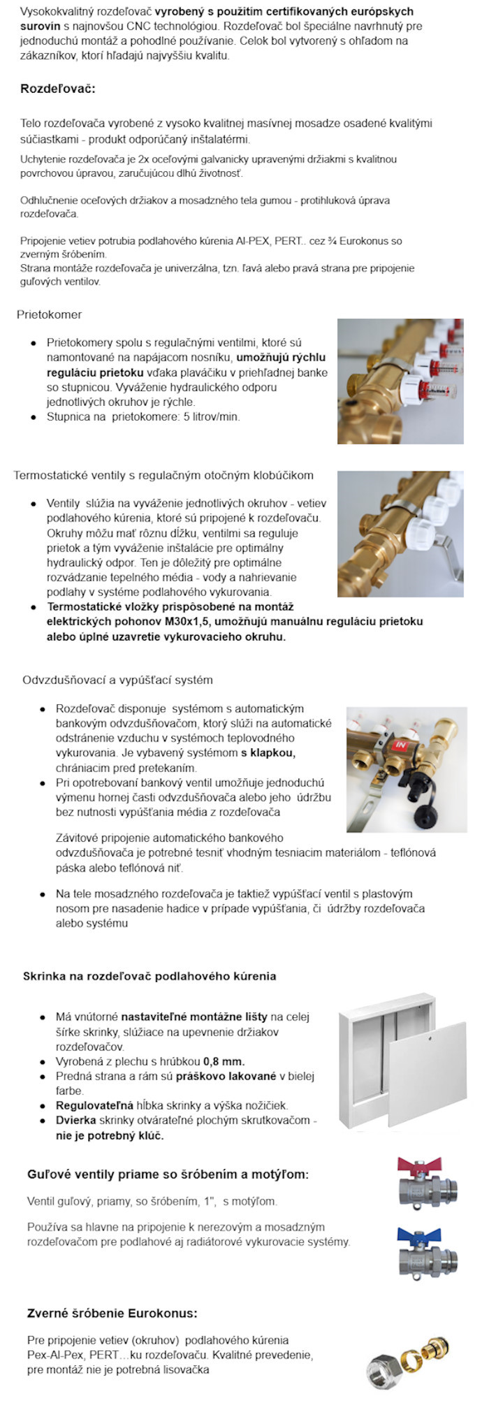 - 1 ks rozdeľovač: mosadzné telo s uzatváracími ventilmi, regulačné prietokomery, 2x oceľový držiak, 2x automatický odvzdušňovací bankový ventil G 1/2", 2x vypúšťací ventil G 1/2" s nosom pre hadicu, pripojenie okruhov je Eurokonus pre 16mm rúru