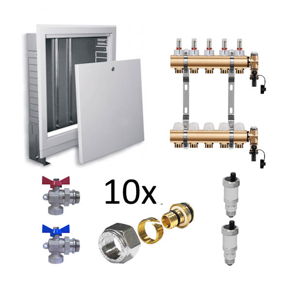 - Set pre 5 okruhov skrinka podomietková guľové ventily rohové 1", pre 17mm rúrku