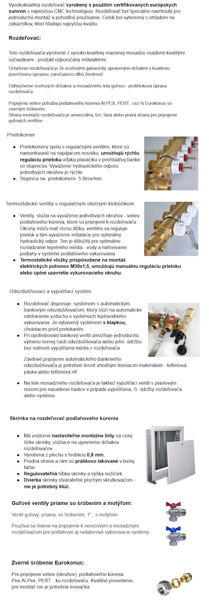- 1 ks rozdeľovač: mosadzné telo s uzatváracími ventilmi, regulačné prietokomery, 2x oceľový držiak, 2x automatický odvzdušňovací bankový ventil G 1/2", 2x vypúšťací ventil G 1/2" s nosom pre hadicu, pripojenie okruhov je Eurokonus pre 17mm rúru